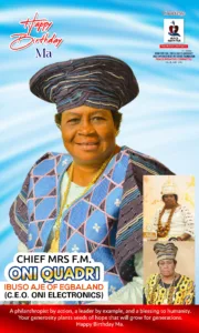 The Chairman of the Peace Initiative Committee (PIC), Ogun Central, Comrade Akeem Abioro, has congratulated Chief Mrs F. M. Oni Quadri Ibuso Aje of Egbaland, the Chief Executive Officer of Oni Electronics, on the occasion of her birthday, describing her as a symbol of dedication, competence and progressive leadership.